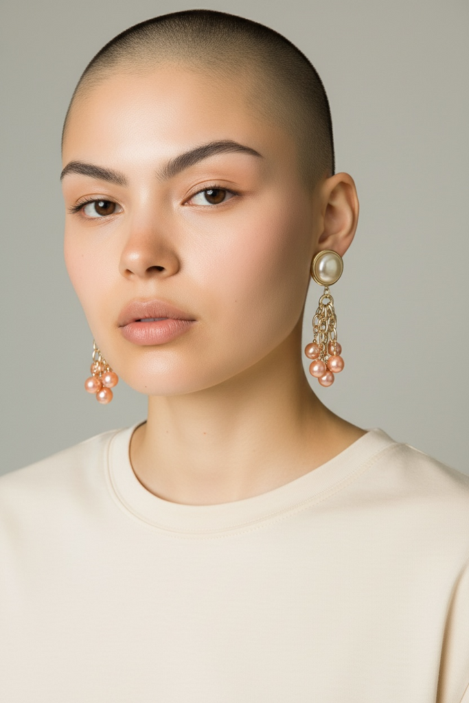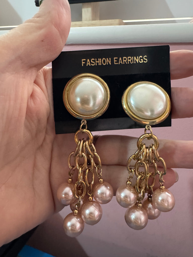 This is a pair of 1980s deadstock (never sold or worn before) clip on faux pearl and gold waterfall style earrings with shimmer pastel pink beads. In original packaging.