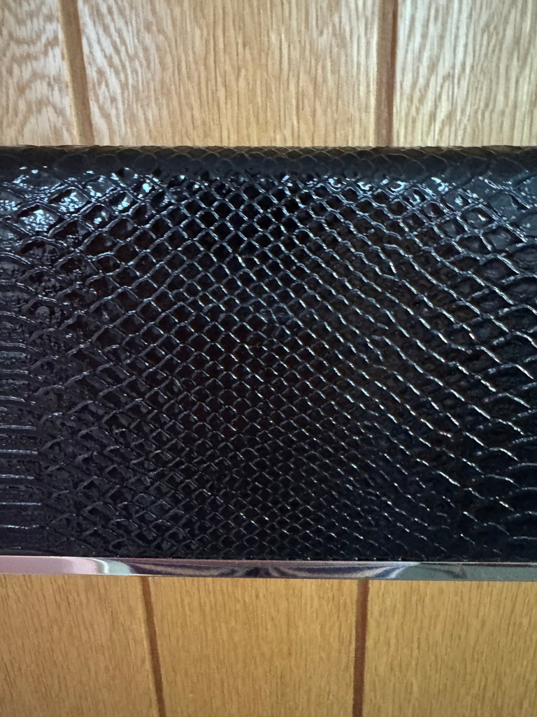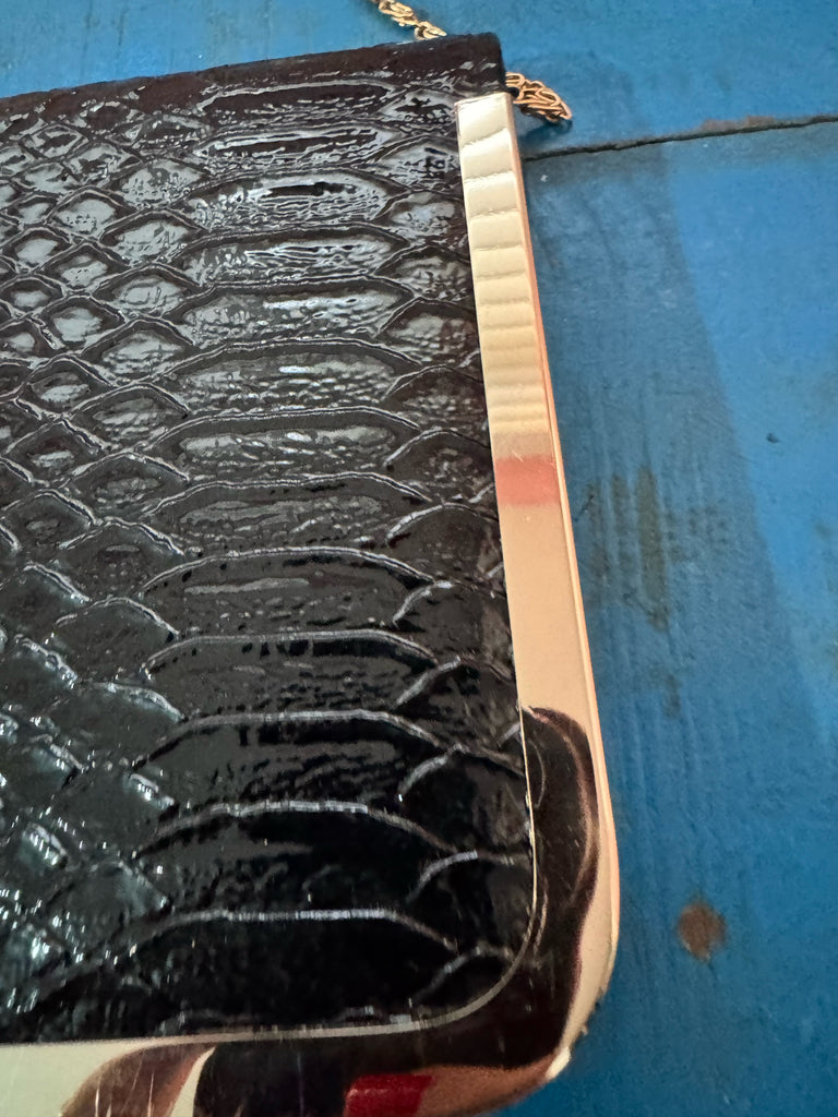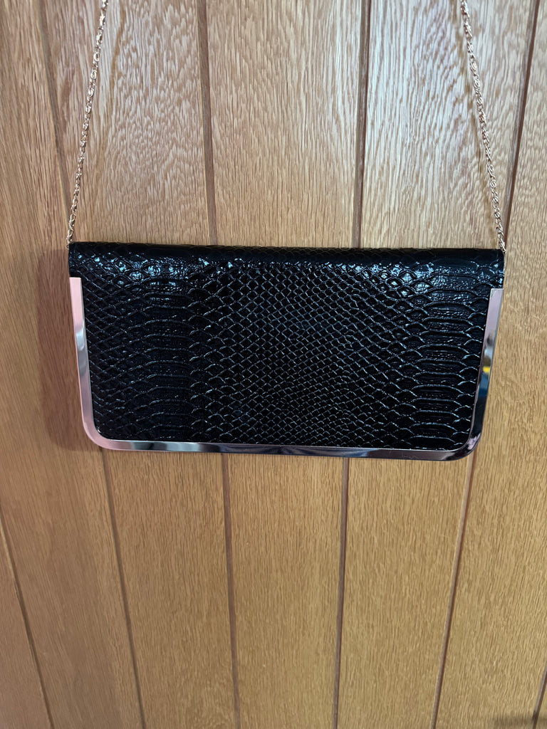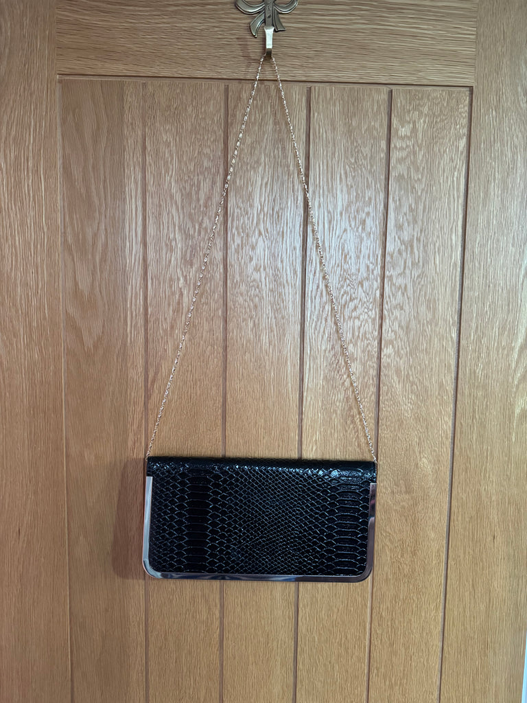 This is a new with tags perfect condition black faux leather handbag with gold metal trimming and a long gold metal snail chain. Lined in black cotton. Can be worn crossbody or on the shoulder.