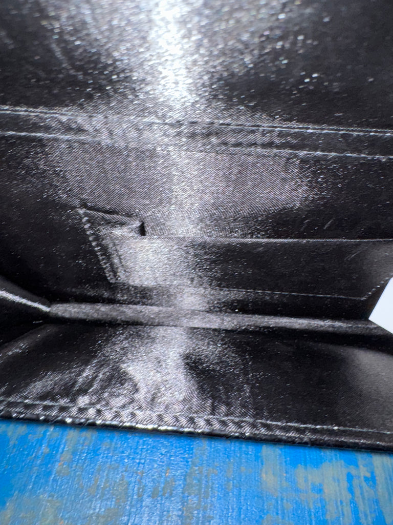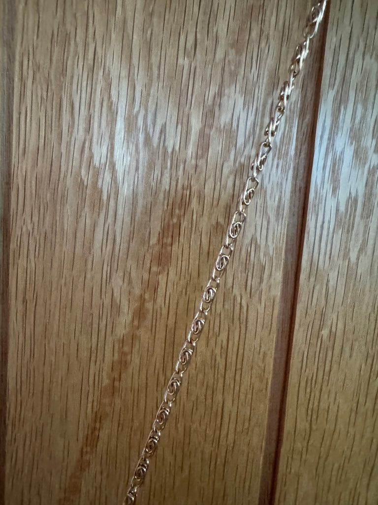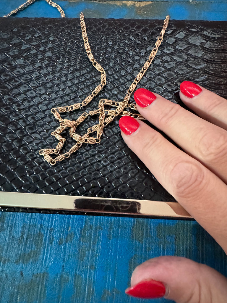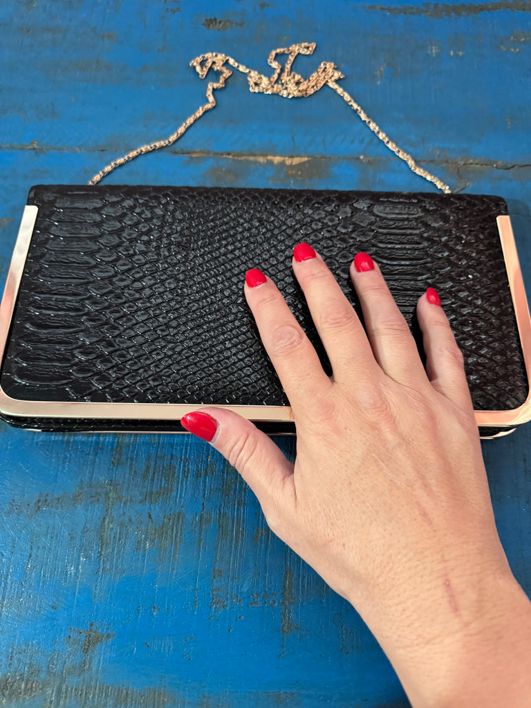 This is a new with tags perfect condition black faux leather handbag with gold metal trimming and a long gold metal snail chain. Lined in black cotton. Can be worn crossbody or on the shoulder.