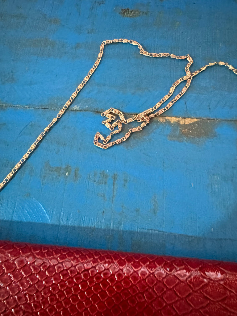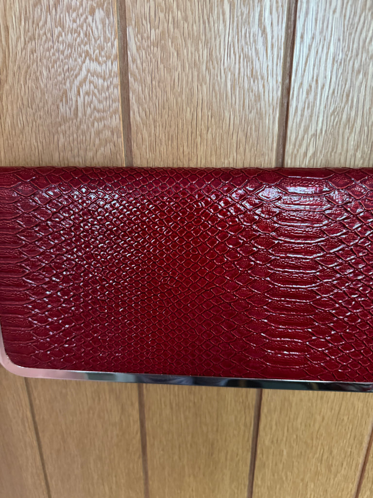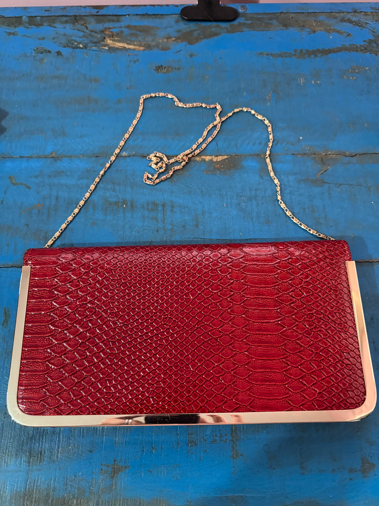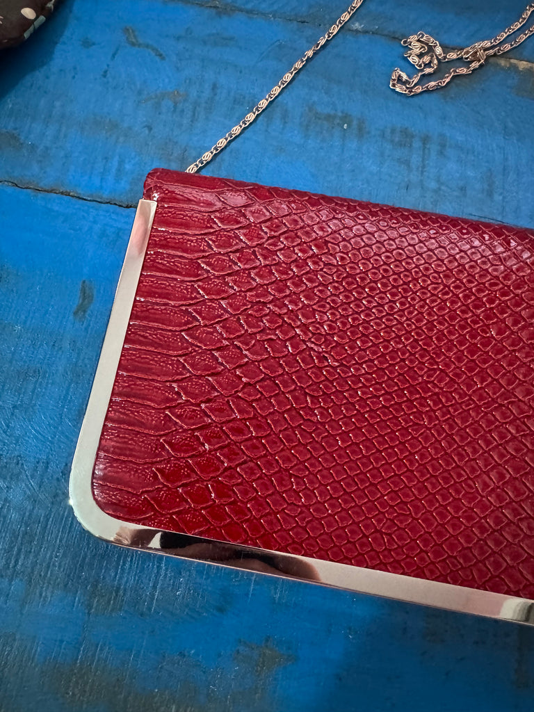This is a new with tags perfect condition red faux leather handbag with gold metal trimming and a long gold metal snail chain. Lined in black cotton. Can be worn crossbody or on the shoulder.