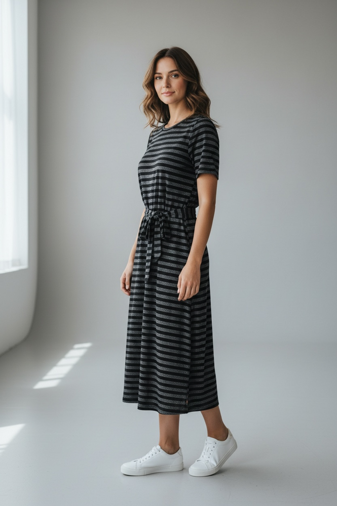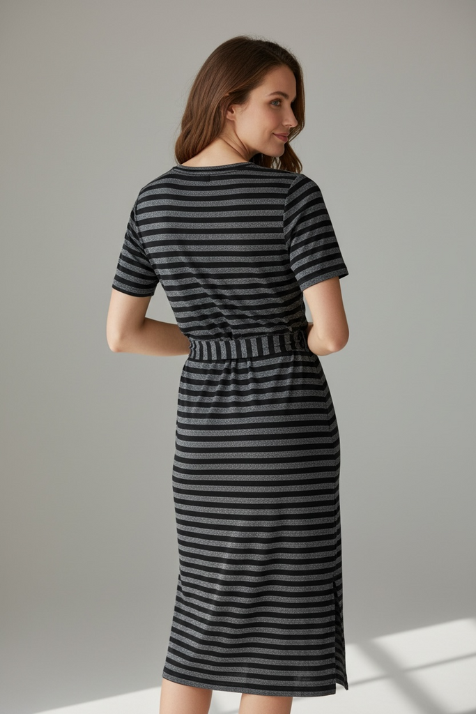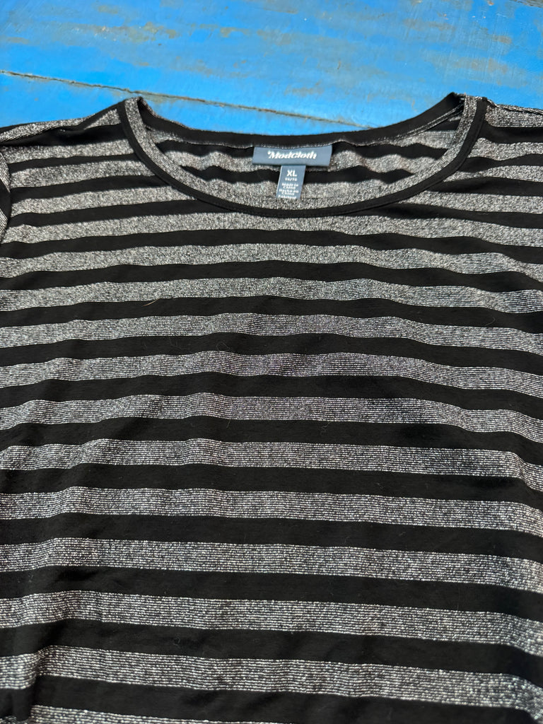 This is a dress by ModCloth in an XL. It has black and grey metallic sparkle stripes, short sleeves, round neck and same fabric long belt. It is a midi to midaxi length, depending on your height. Perfect condition. It has a nice stretch to the fabric.