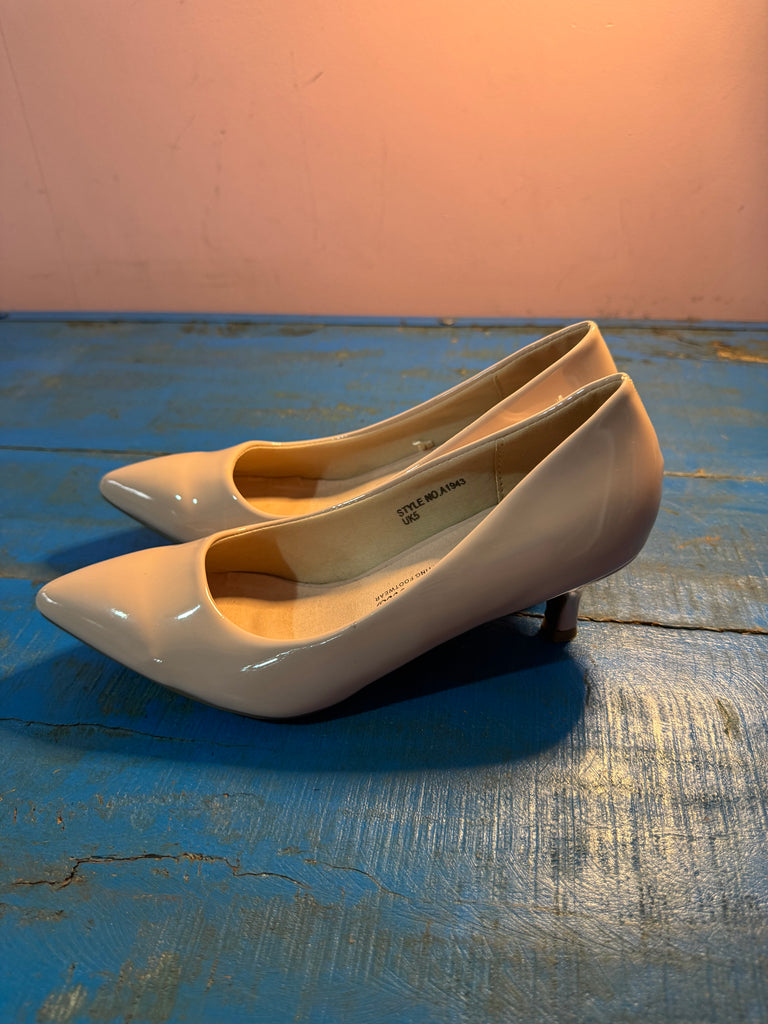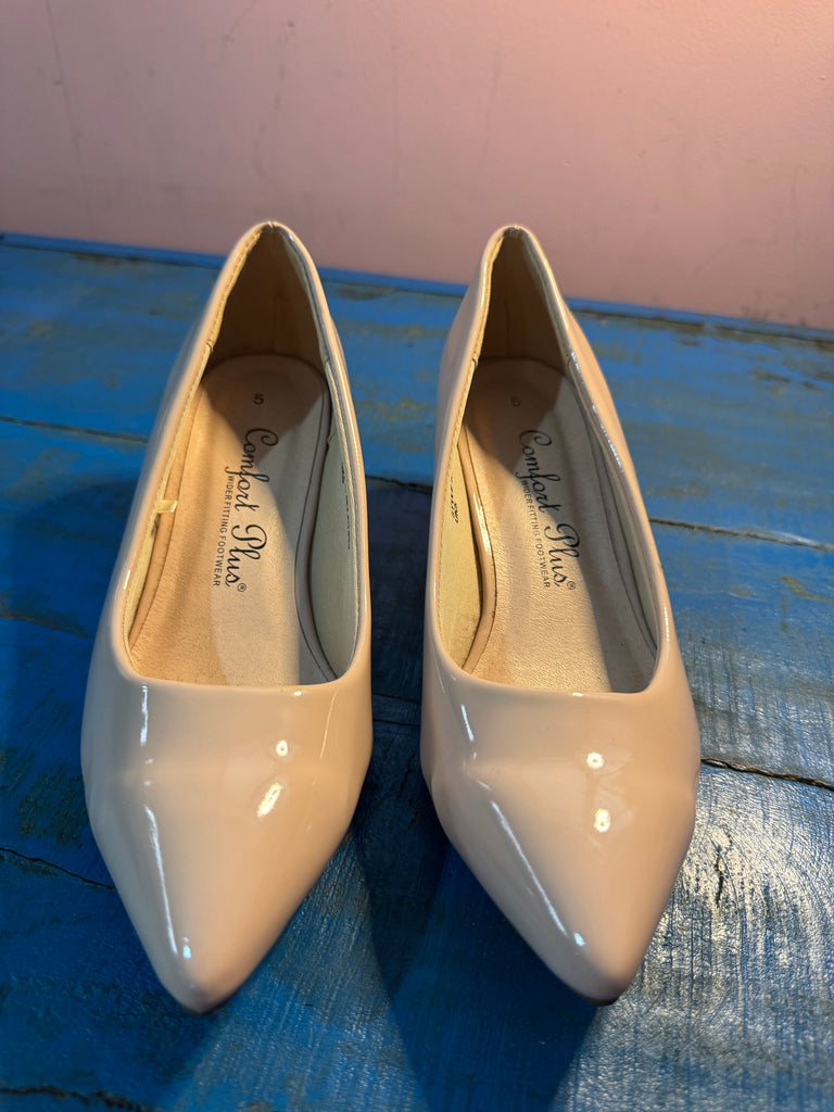 TOYAH BEIGE PATENT LOWER HEELED SHOES