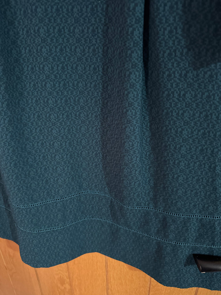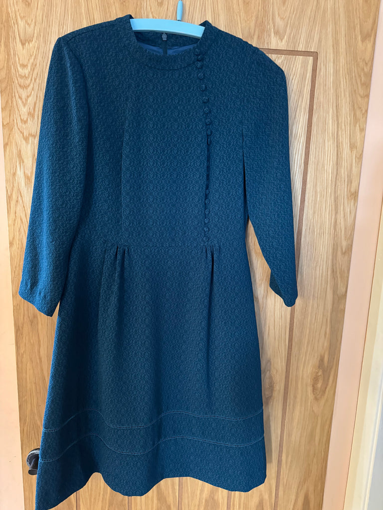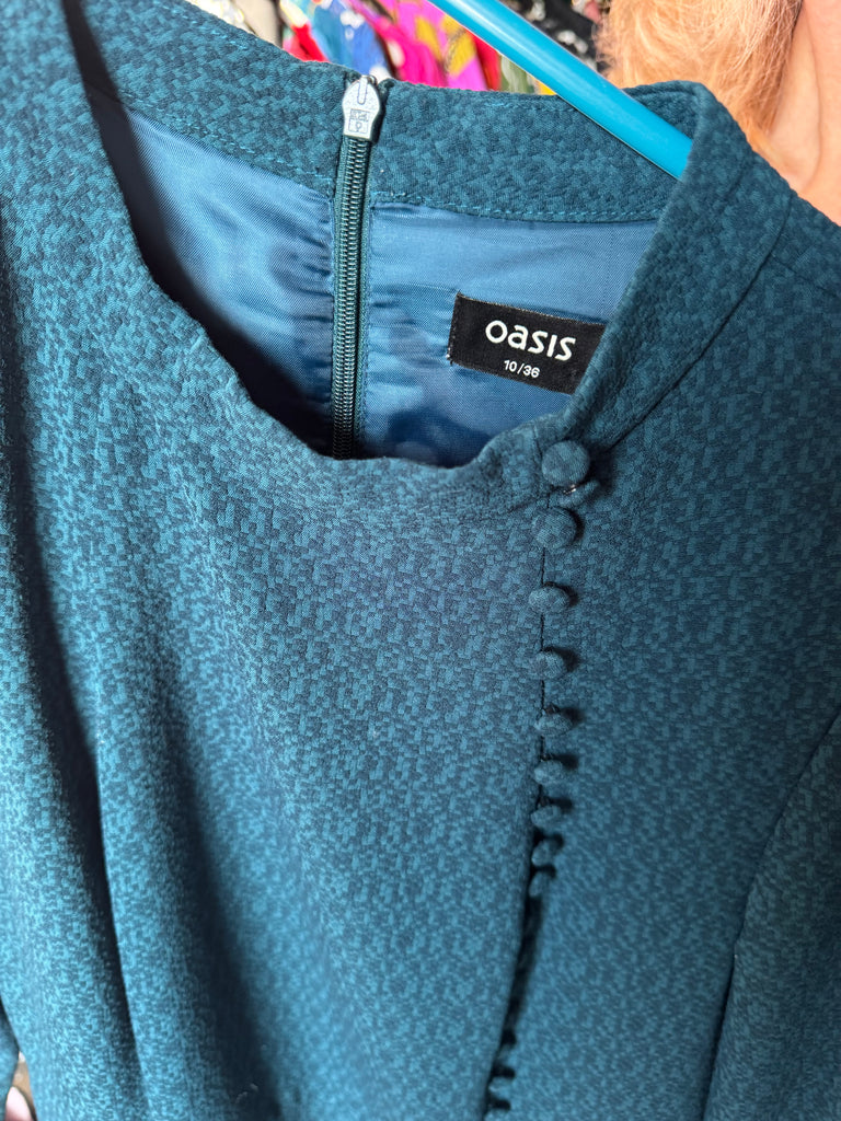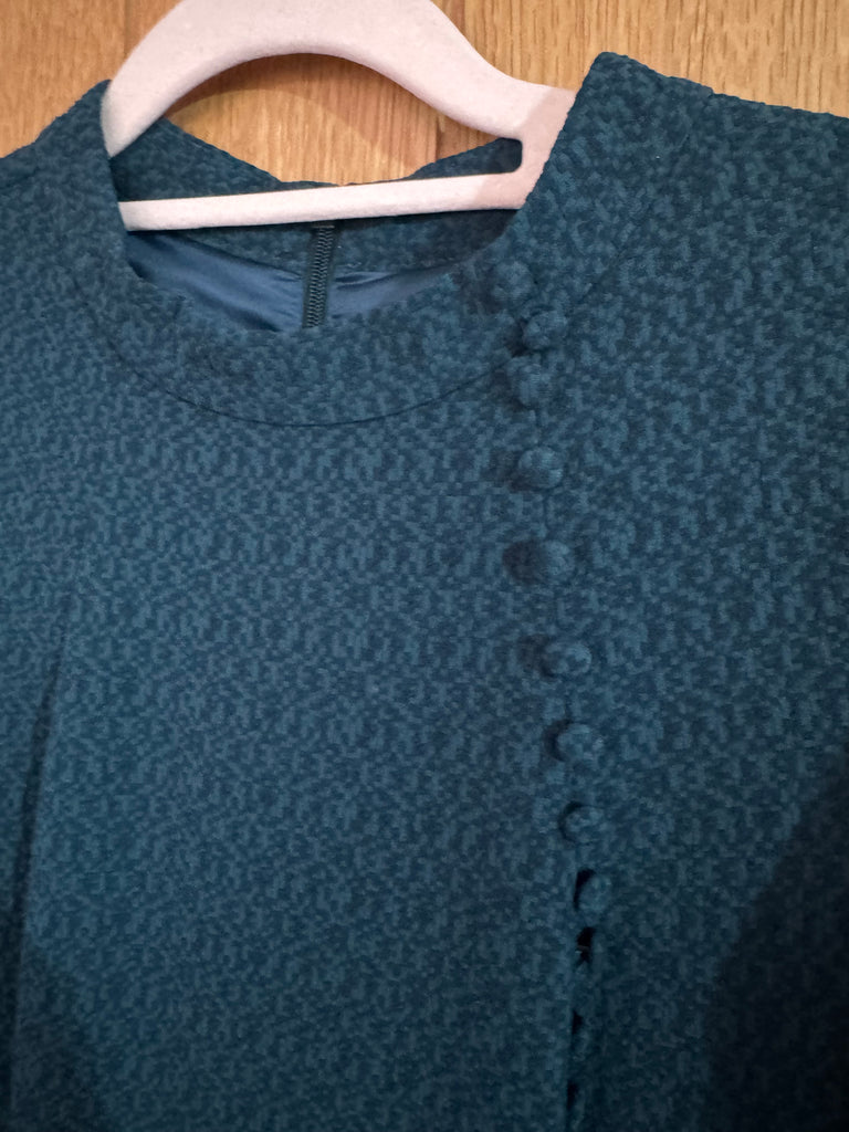 This is a Y2K vintage Oasis dark green dress in a UK 10 that belonged to singer and actor Toyah Willcox. It has long sleeves and beautiful fabric covered buttons to front.
