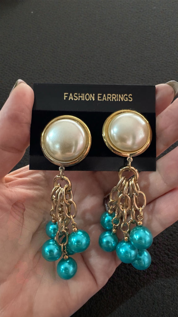 This is a pair of 1980s deadstock (never sold or worn before) clip on faux pearl and gold waterfall style earrings with shimmering turquoise beads. In original packaging.