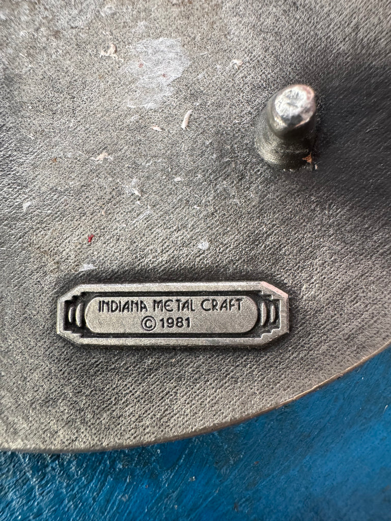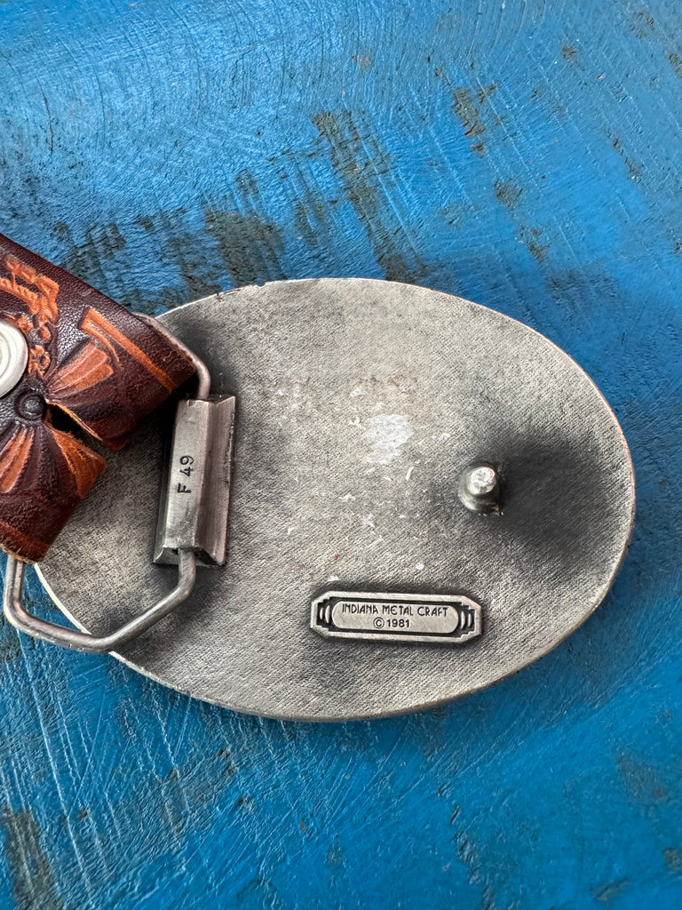 Reverse of buckle says F49 Indiana Metal Craft ©️1981