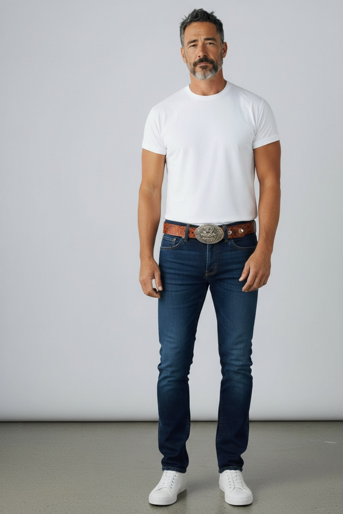 1981 VINTAGE BROWN LEATHER BELT WITH SILVER COWBOY BUCKLE