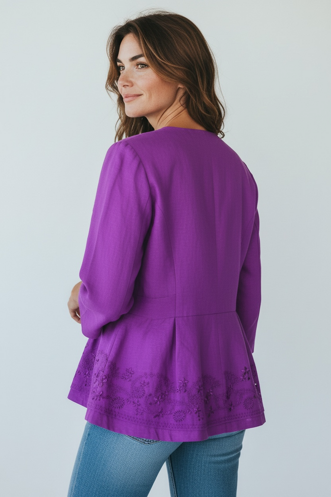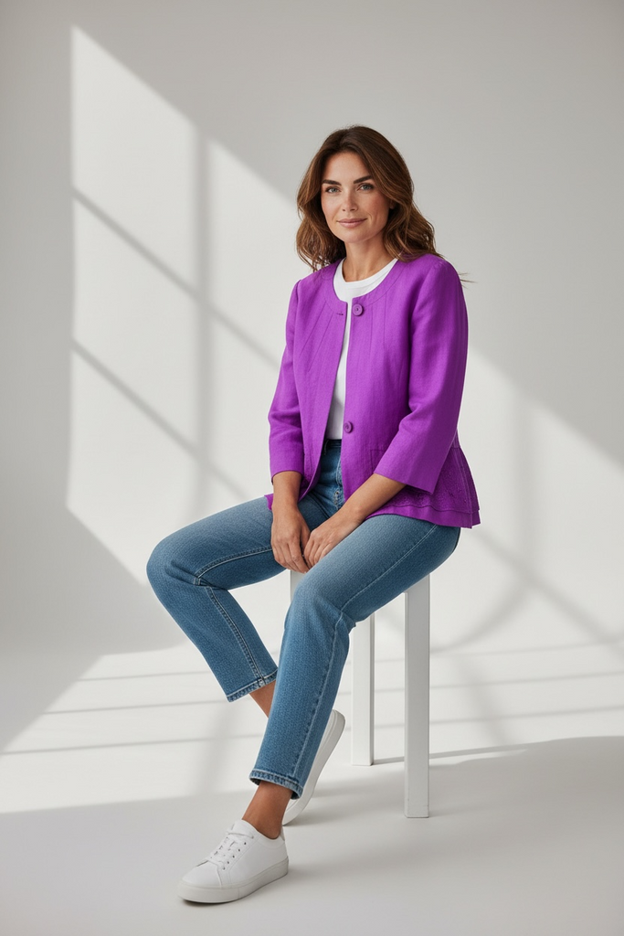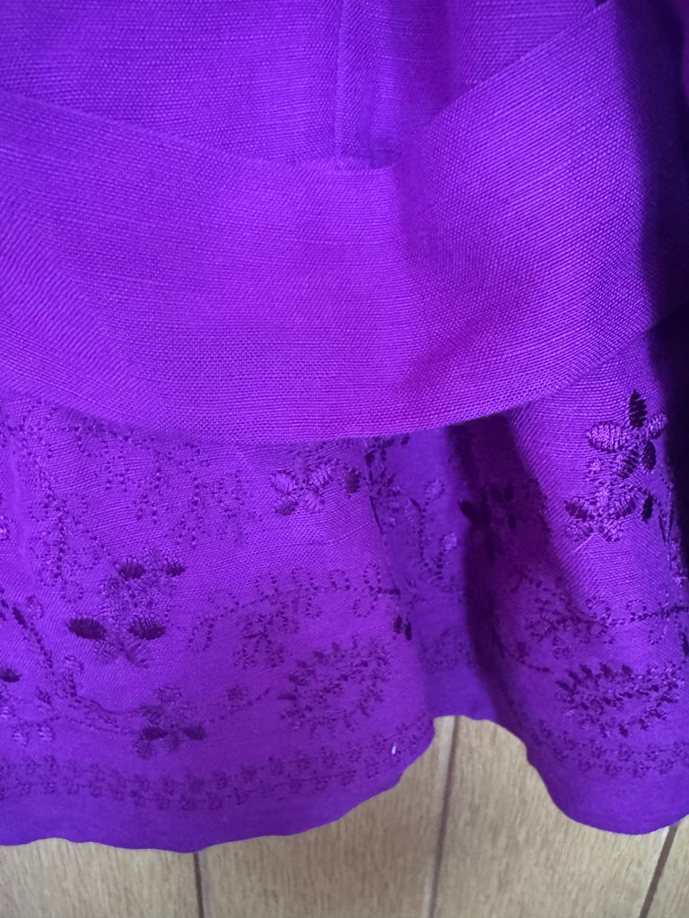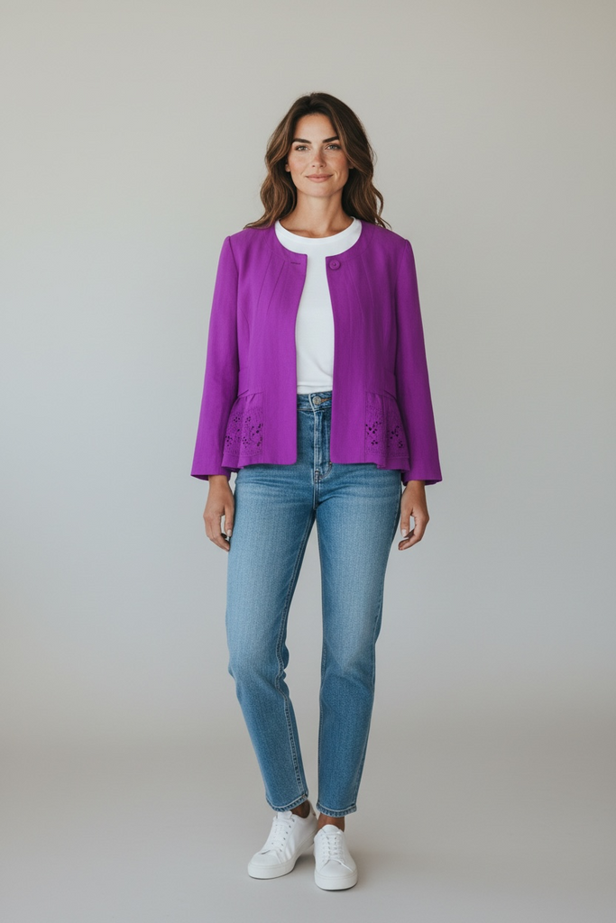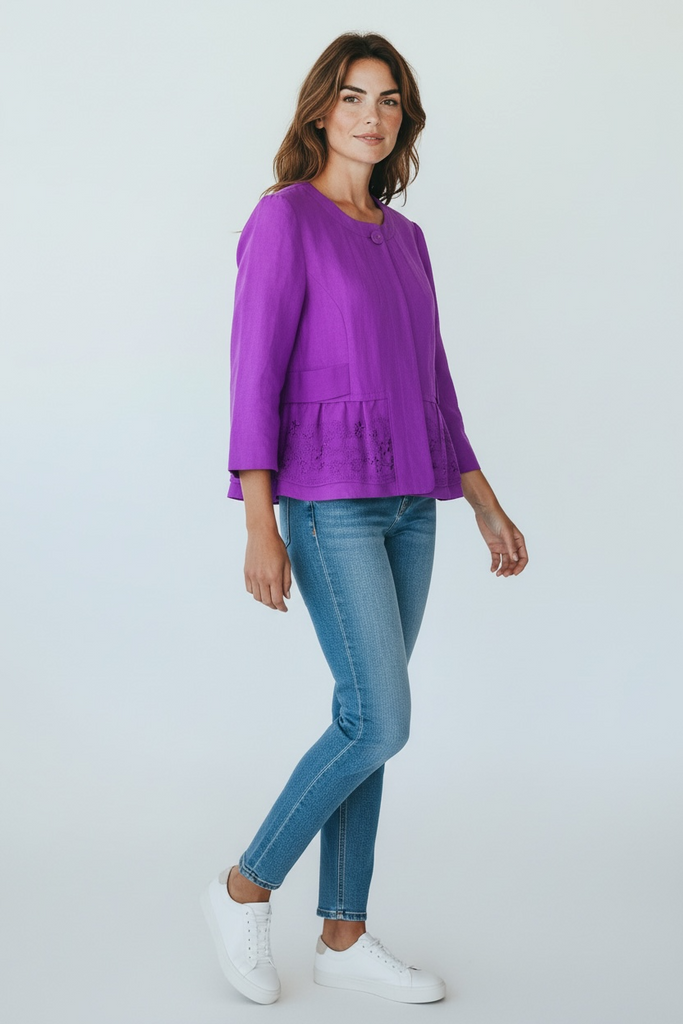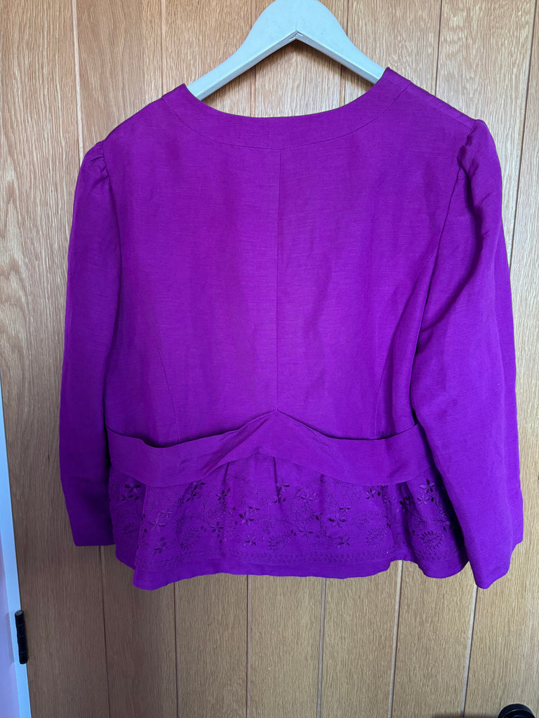 This is a beautiful purple jacket with broderie anglaise hem by the designer Jeff Banks. Has 3/4 length sleeves, three fabric-covered buttons that fasten at the front and it is fully lined.