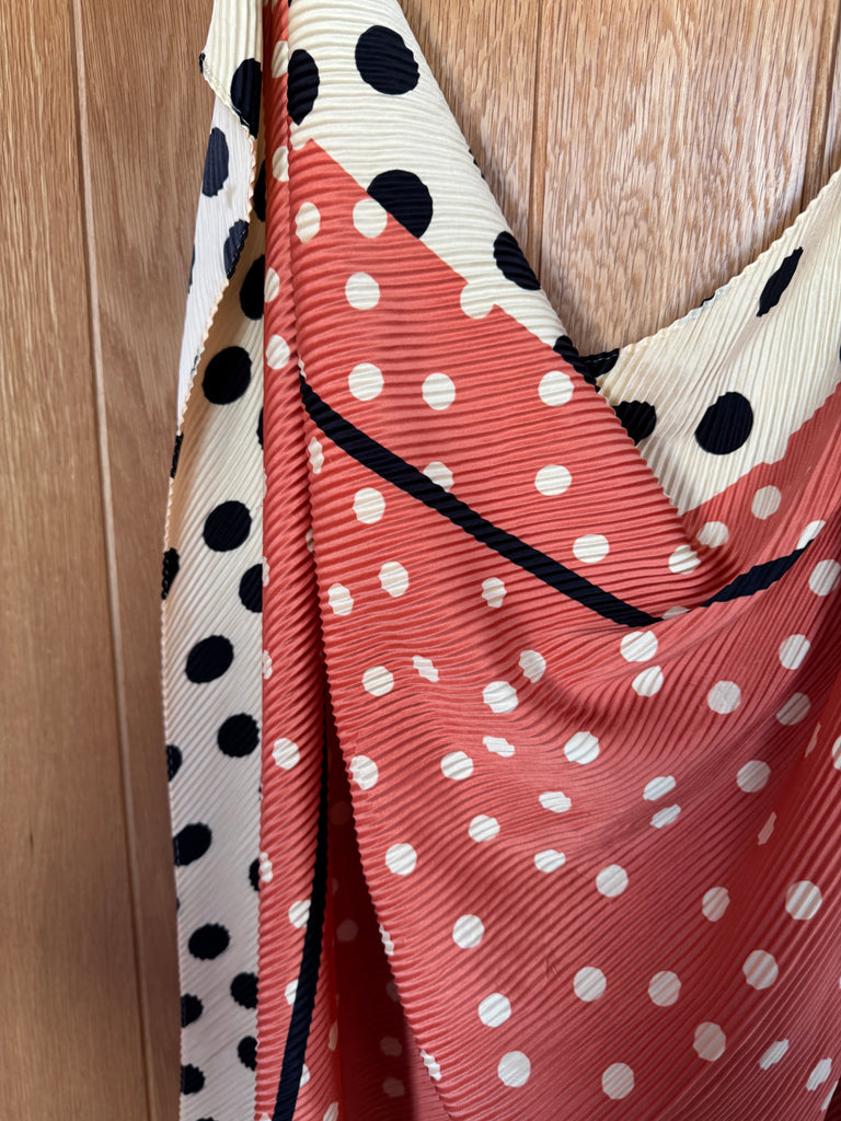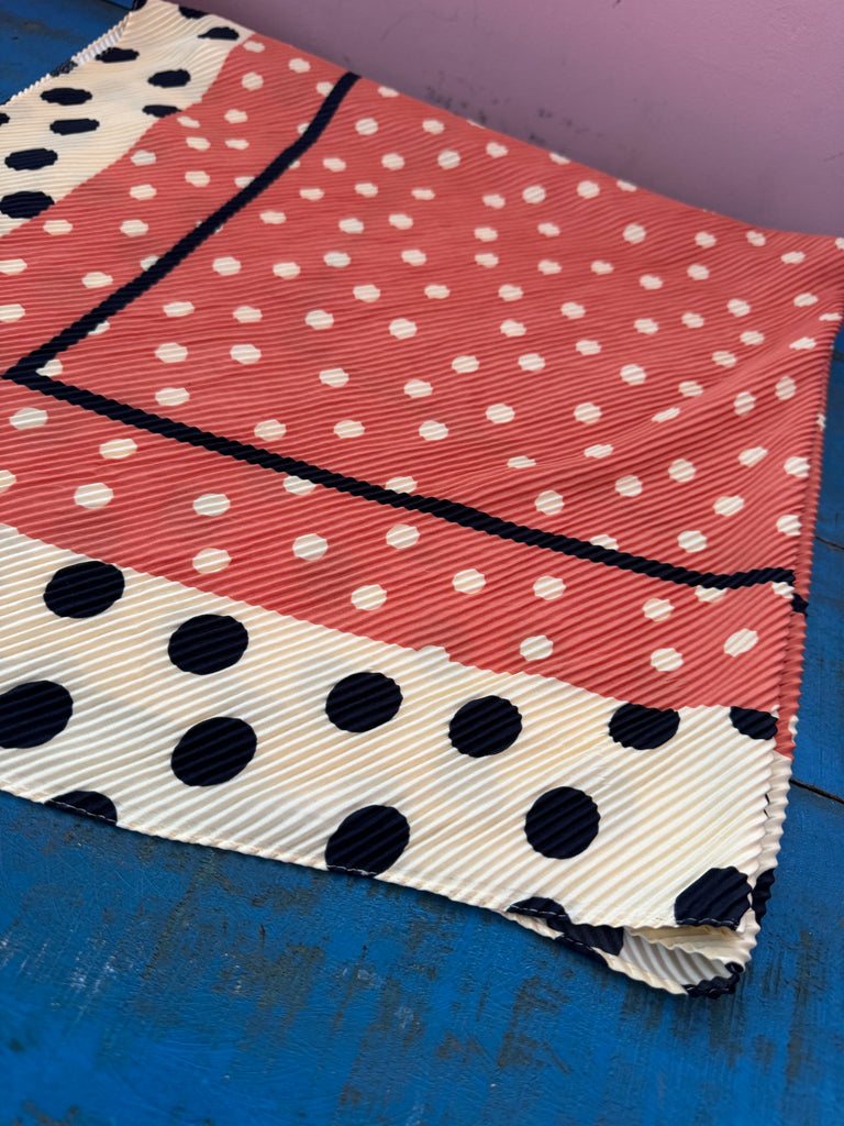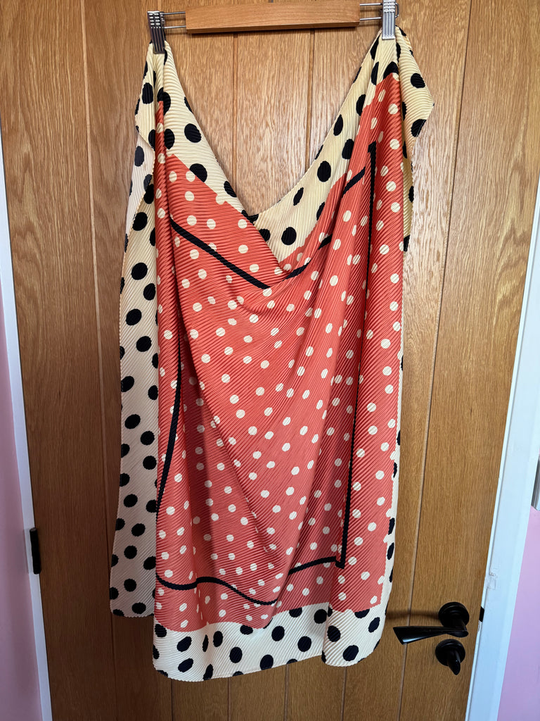 This is a large polka dot crinkle-style scarf in shades of cream, black, white and burnished orange. Excellent condition.