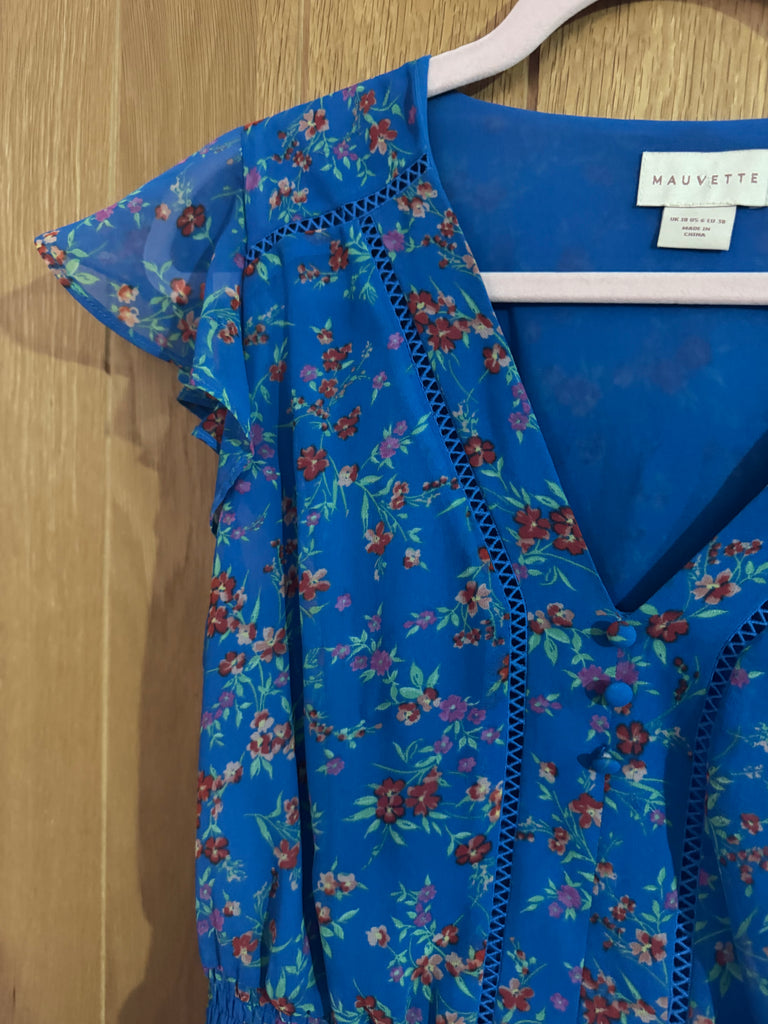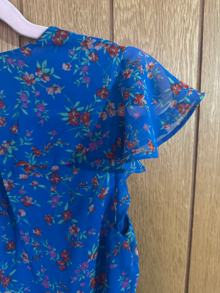 This is a sweet blue blouse with red, orange and purple ditsy floral print. Has three feature buttons and cut out design. So cute. Has short ruffle sleeves, elasticated waist and is lined.