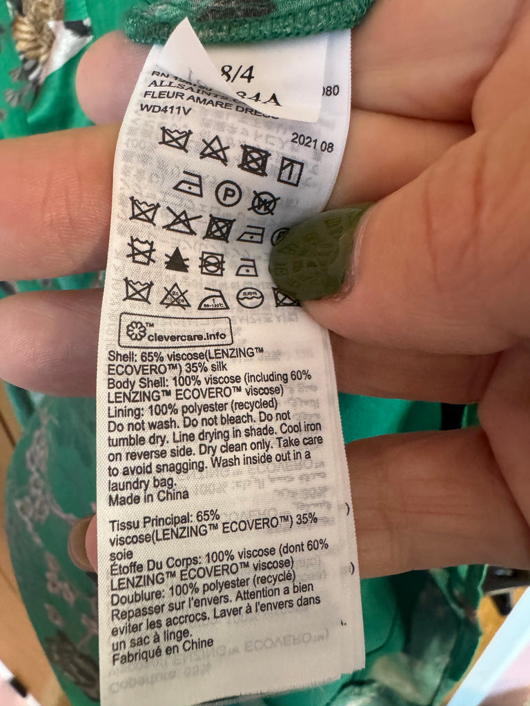 This is a beautiful silk mix dress by the expensive brand All Saints and it is their Fleur Amare dress. It was exclusively owned by the UK musician and actor Toyah Willcox and was worn by her for the opening night of her Cabaret All Star Residency at the Proud Embankment venue in London in November 2021.