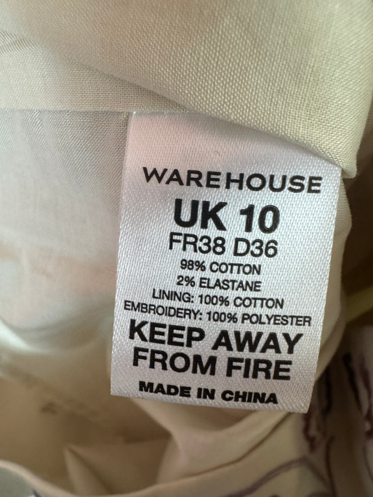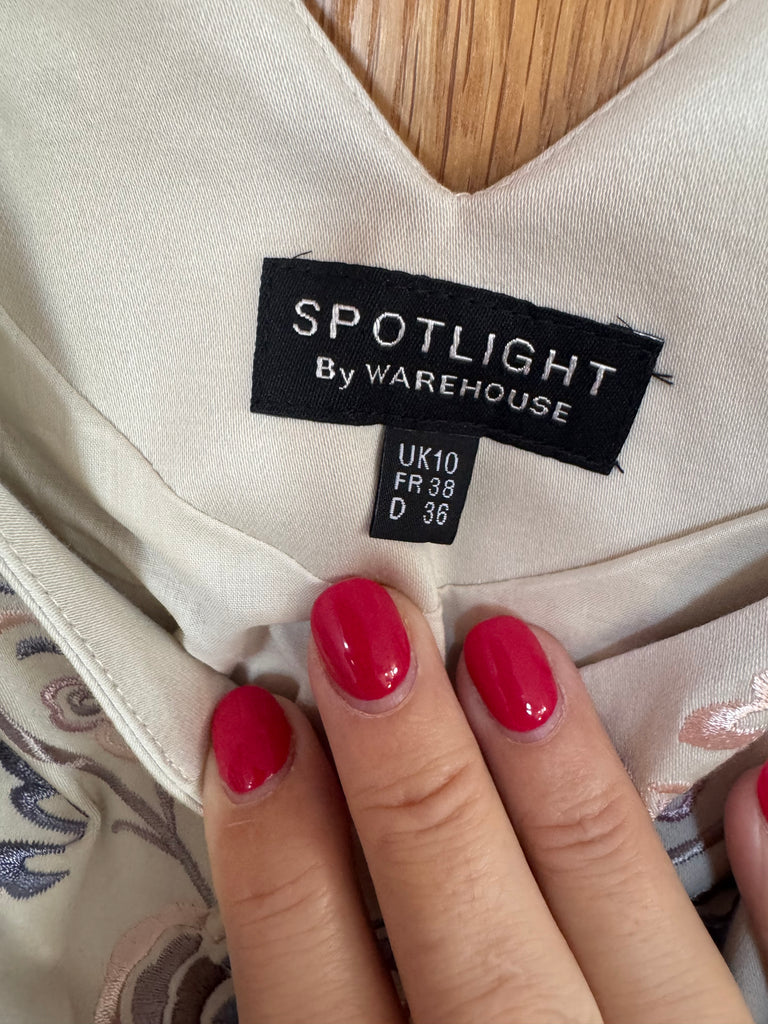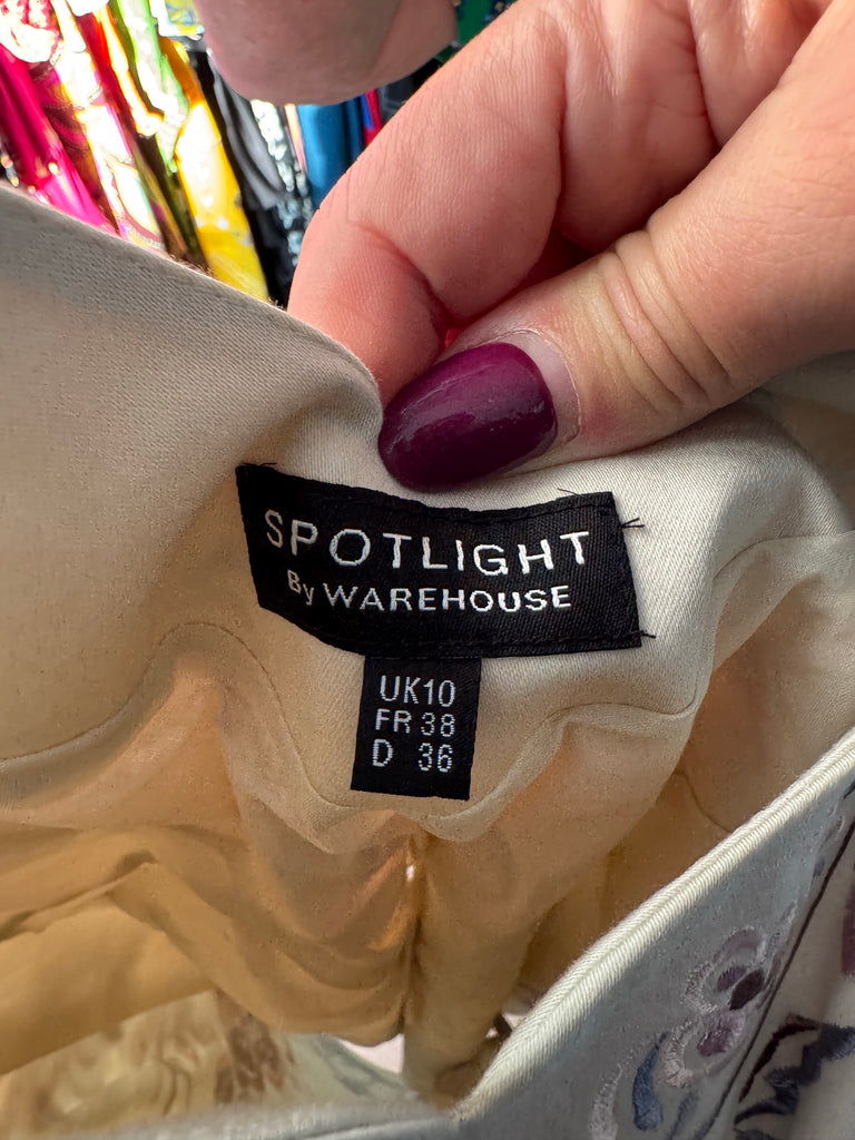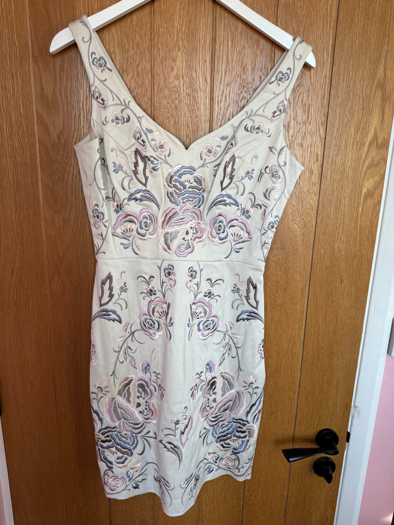 This is a vintage Spotlight by Warehouse embroidered dress in a UK 10 that belonged to singer and actor Toyah Willcox. It is cream with a stunning floral design embroidery in shades of pink and mauve. Lined. We have two available.